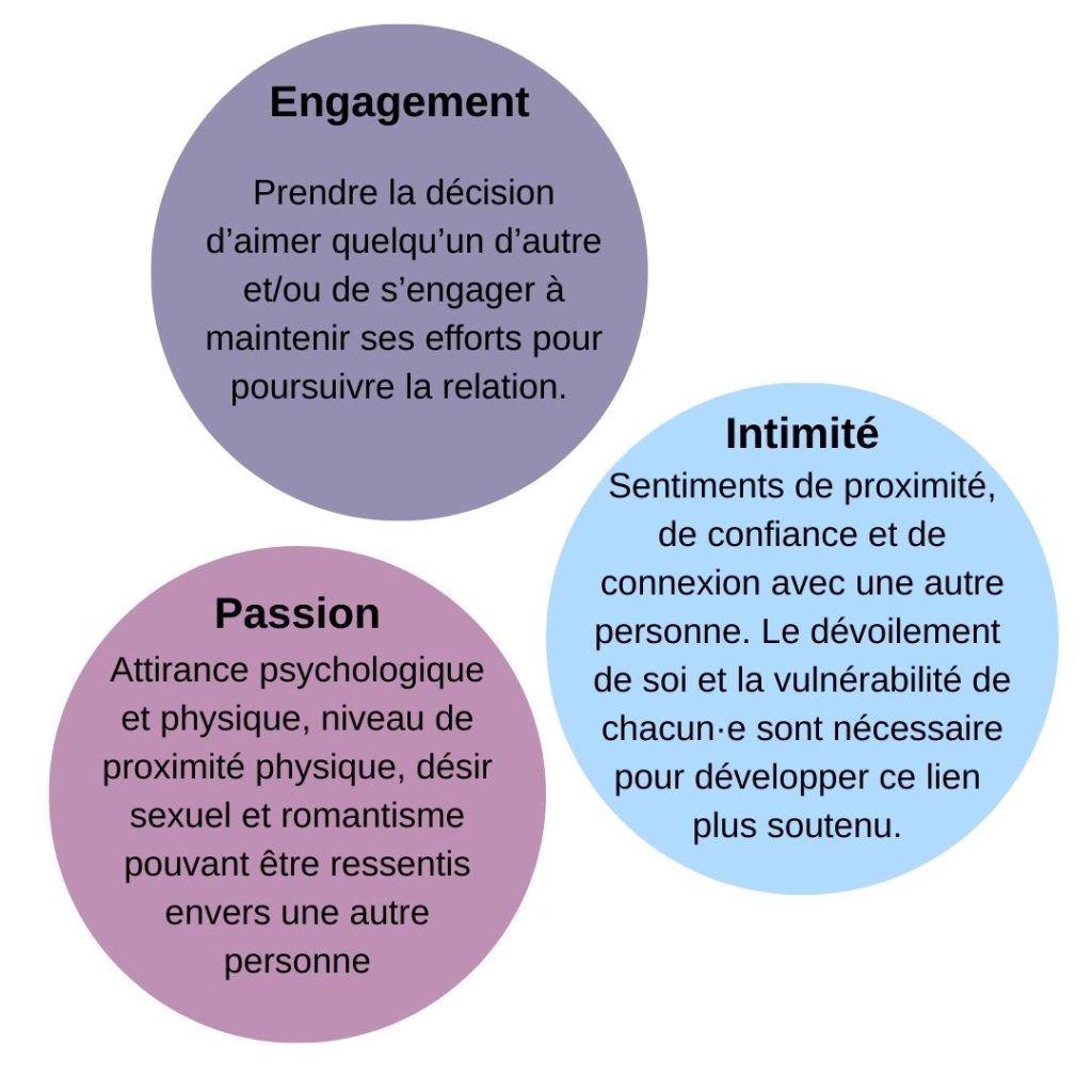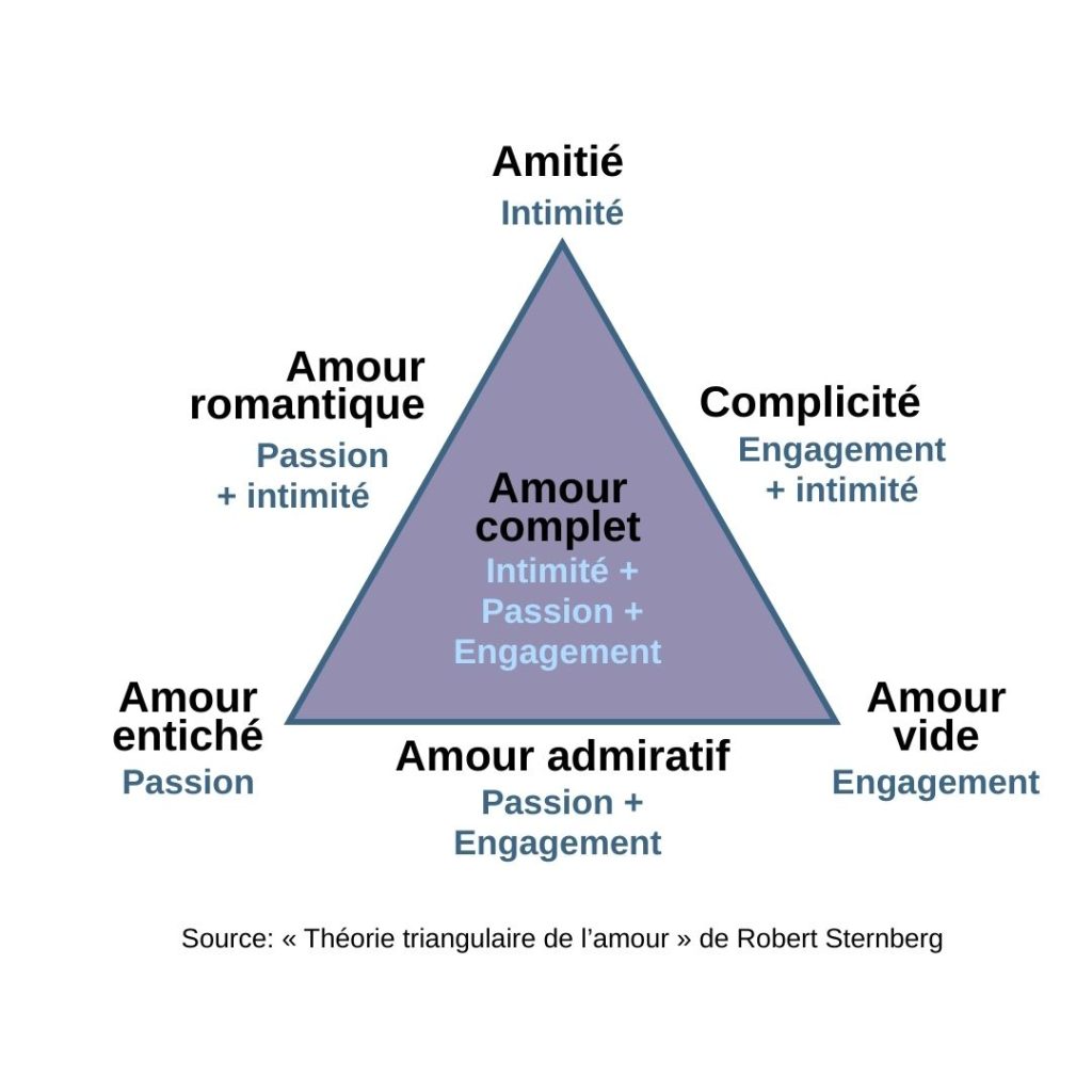 Le psychologue américain Robert Sternberg décrit que l’amour serait composé de trois éléments clés : la passion, l’intimité et l’engagement. En combinant ces trois ingrédients, à différents degrés, il serait possible de distinguer sept grands types d’amour qui en découlent. Ces types d’amour sont généralement représentés à l’aide d’un triangle où les trois concepts clés se retrouvent aux pôles.